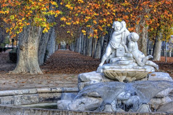 Aranjuez es un invento de Felipe II, que harto de los calores de la corte madrileña, mandó planificar un real sitio, un lugar de esparcimiento destinado solo a la corte, en un paraje fresco y de abundante caza a orillas del Tajo. Una especie de parque temático de la buena vida cortesana donde se cocieron durante siglos las intrigas del reino y que fue creciendo con sus sucesores. Así lo percibe aún el viajero moderno cuando ingresa en los jardines que rodean el Real Sitio. Hoy se visita entre otros el Jardín del Parterre,de clara influencia francesa, y el Jardín de la Isla, que llega hasta la ribera del Tajo y está lleno de senderos que surcan bosques de árboles centenarios salpicados aquí y allá por plazas con fuentes diseñadas por el mismísimo Sabatini, el arquitecto italiano traído por Carlos III para hacer de Aranjuez un lugar civilizado a la altura de cualquier corte europea.
